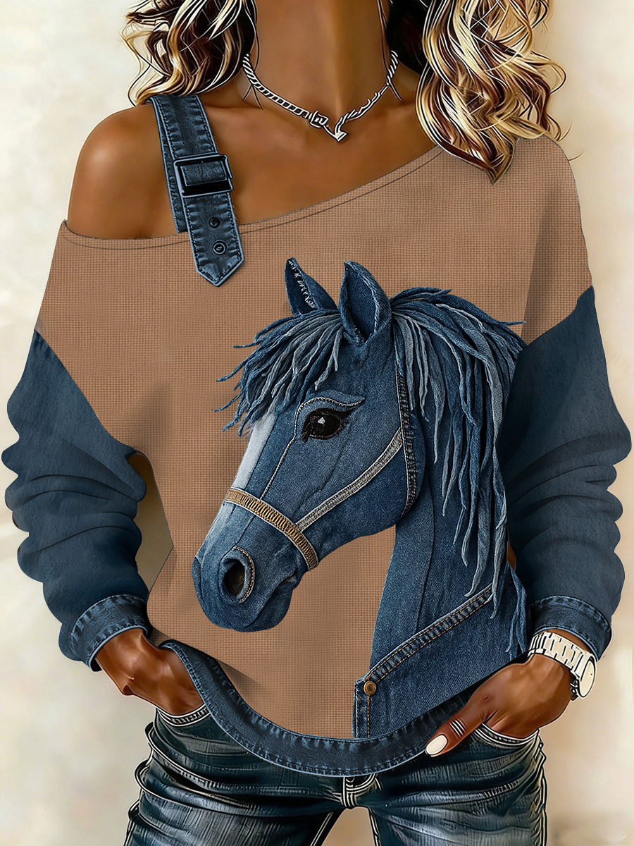 Women's Vintage Horse Art Patchwork Print Casual Off-Shoulder Sweatshirt